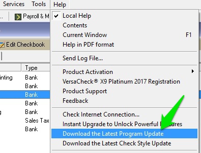 1) Make sure the all of the Versacheck programs being used are UPDATED to the most recent file version. To do that, go to HELP - DOWNLOAD THE LATEST PROGRAM UPDATE...