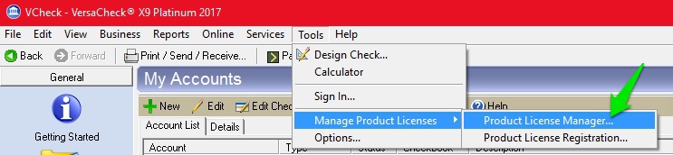 2) Once the program is updated, go to the license manager in the Versacheck program, TOOLS - MANAGE PRODUCT LICENSES - PRODUCT LICENSE MANAGER.